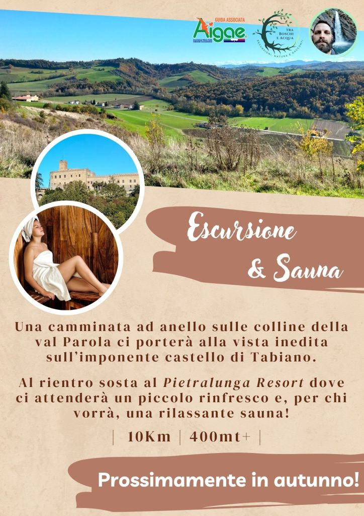 L’escursione parte lungo una breve salita che ci porterà al Santuario di Montemanulo, a questo punto inizierà una bella carraia immersa nel verde che ci condurrà al guado del torrente Gisolo e, risalendo, a sfiorare il magnifico castello di Tabiano. A questo punto, dopo le dovute foto di rito, scenderemo per guadare nuovamente il Gisolo e tornare lungo la costa che separa la val Parola dalla val Gisolo, questo ultimo tratto ci regalerà alcuni scorci di queste due dolci vallate, fino ad accompagnarci al punto di partenza dove, chi vorrà, potrà rilassarsi nella nuovissima sauna del Pietralunga Resort.